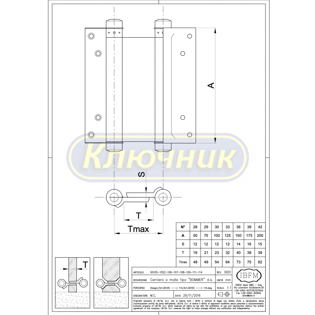 Петля маятниковая Итальянского производителя IBFM. Высота 175 мм. Усиленная, для распашных дверей, с регулировкой пружины преднатяга. Для дверей до 55 кг из расчета на две штуки.